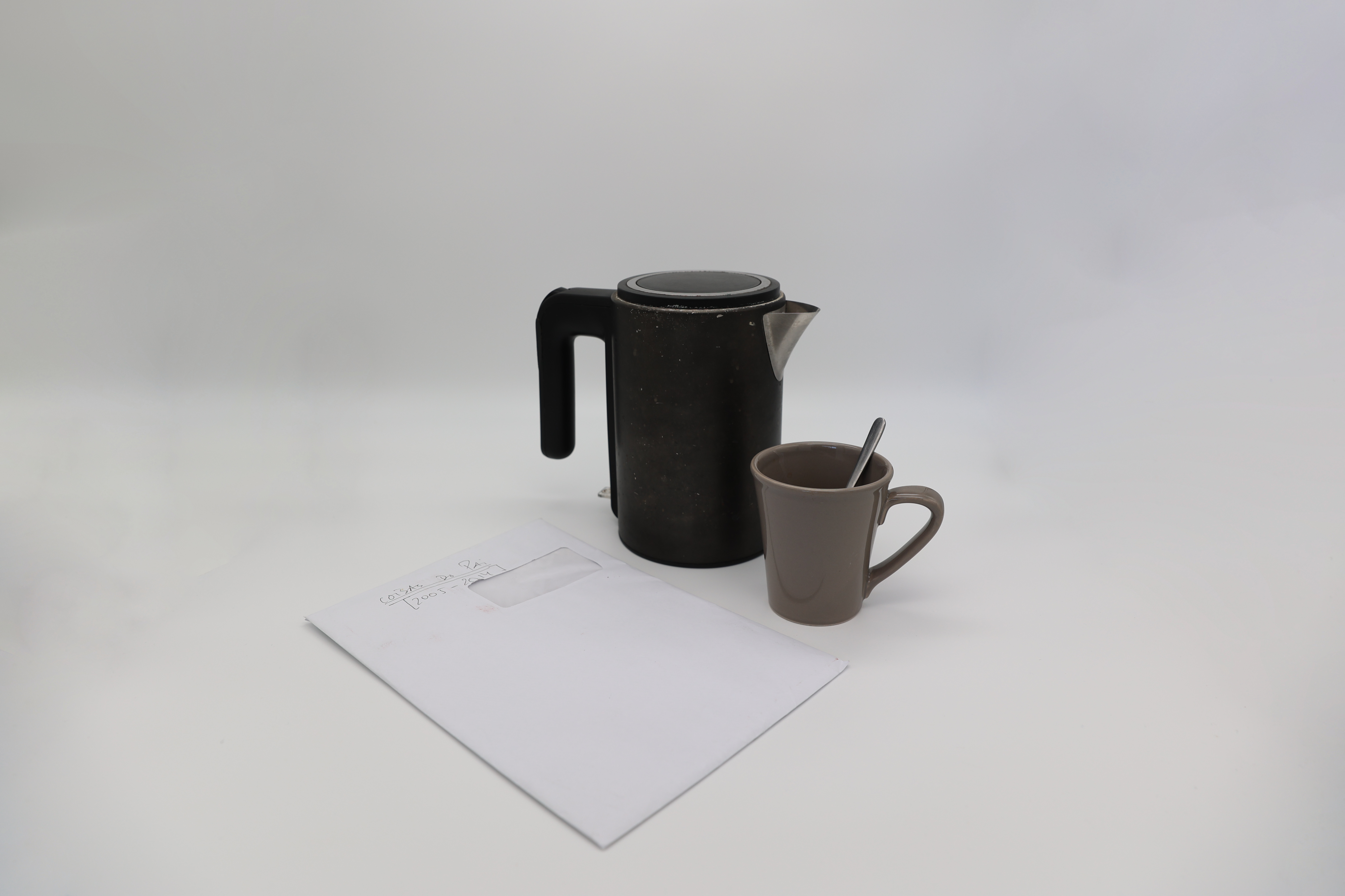 Fervedor de água, caneca com café e envelope "Coisas do Pai", cena "Pai": O Catastrofista