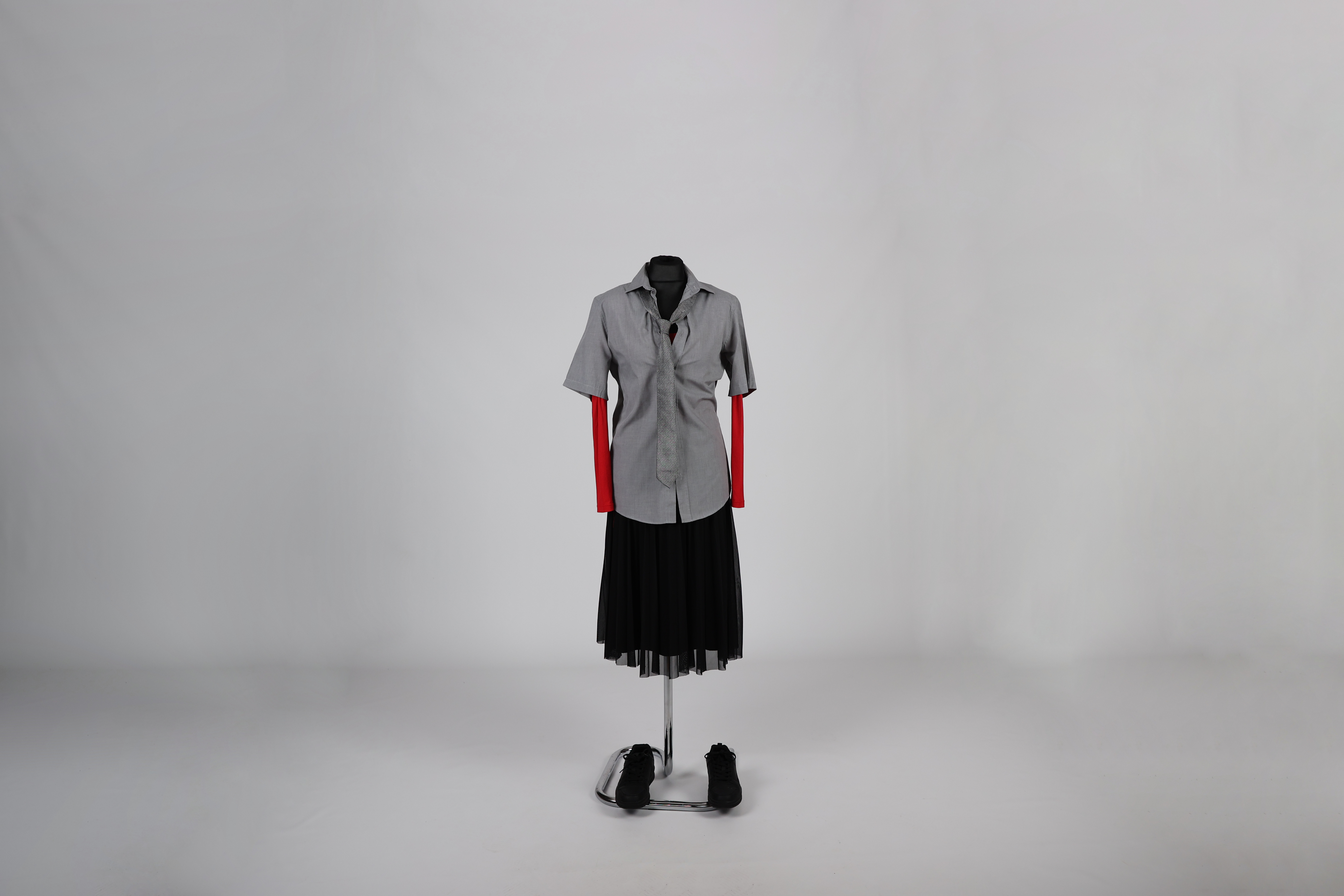 Figurino usado pela intérprete Júlia Lima (camisa de manga curta e gravata cinza com camisola vermelha, saia preta de tule plissado, sapatilha preta) no espetáculo Amor e Informação.