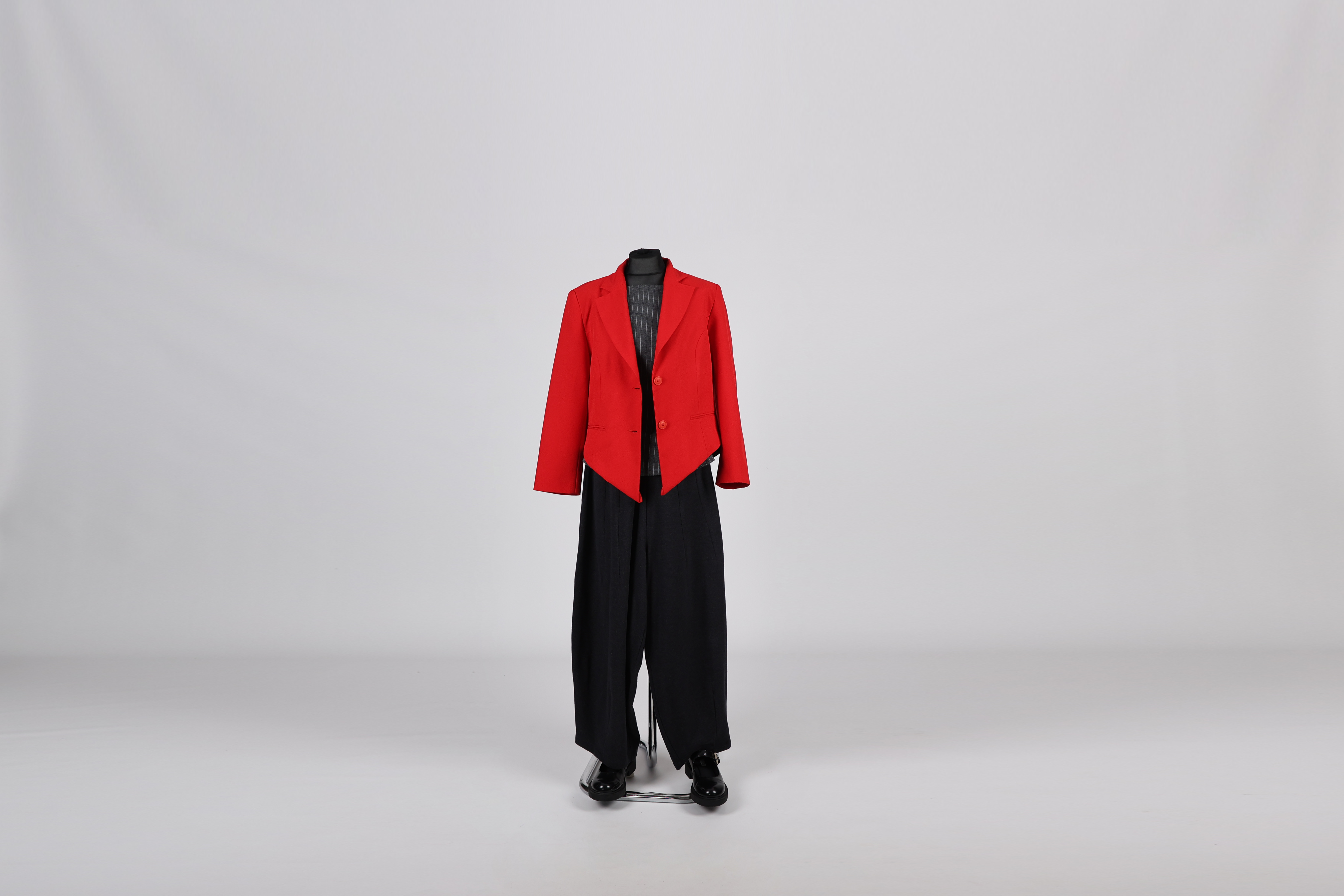 Figurino usado pela intérprete Catarina Moita (blazer vermelho, bluza cinzenta de mangas cavadas, calças pretas e sapatos pretos tipo Mary Jane) no espetáculo Amor e Informação.