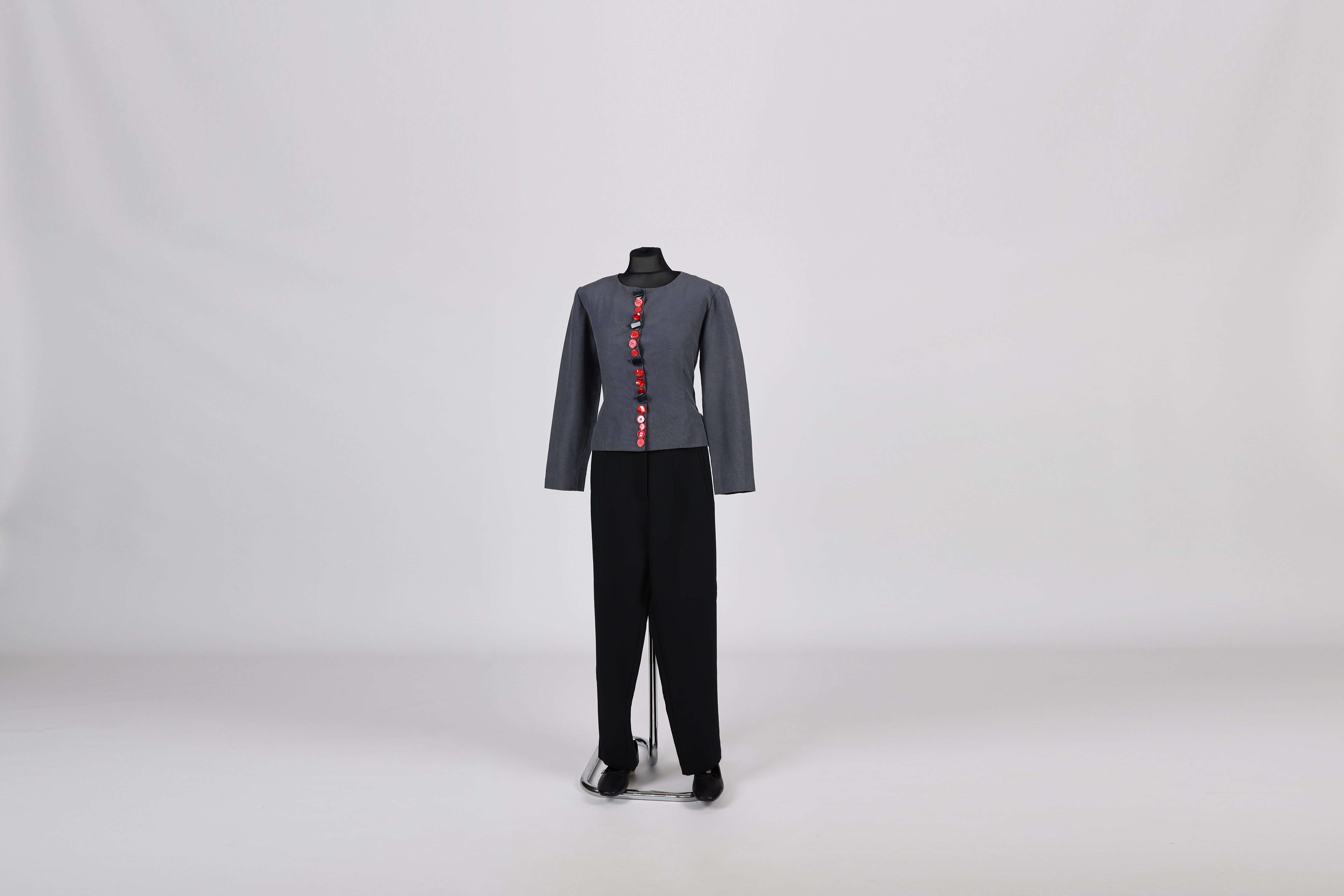 Figurino usado pela intérprete Cláudia Louro (casaco cinzento com botões, calças pretas e sapatos preto) no espetáculo Amor e Informação.