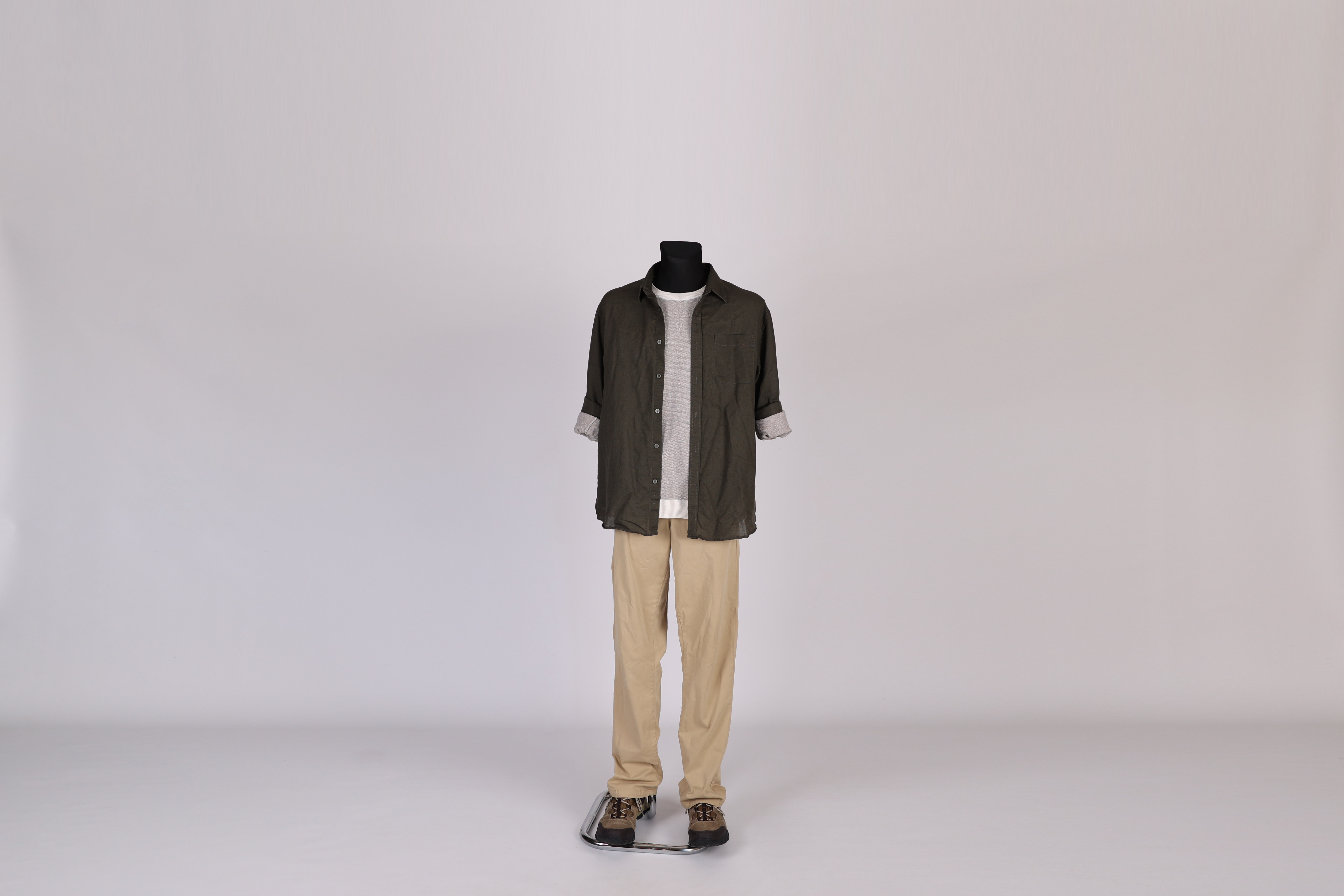 Figurino usado pelo intérprete Ricardo Vaz Trindade (camisa de linho verde escura, camisola de malha castanha, calças caqui e sapatos de campo castanhos) no espetáculo O Catastrofista.